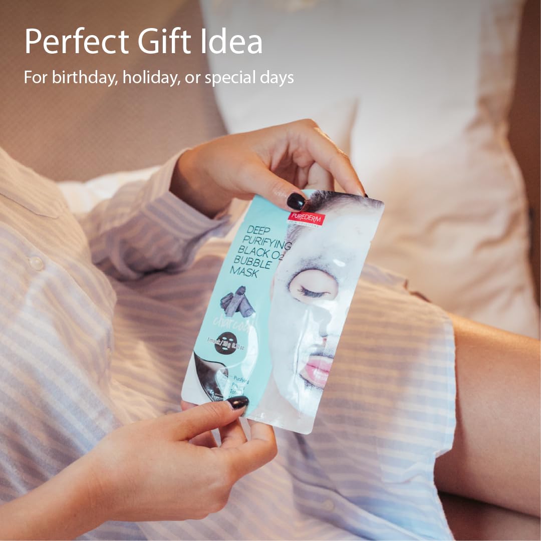 - CHARCOAL BUBBLE MASK- Have you ever seen a bubble mask like this? Watch these bubbles transform into rich foam in 5 minutes - Purederm face mask set’s fine bubbles can be absorbed into the deepest layers of the skin to cleanse excess oil, deep cleanse pores, and help prevent forms of acne, pimples, and blackheads