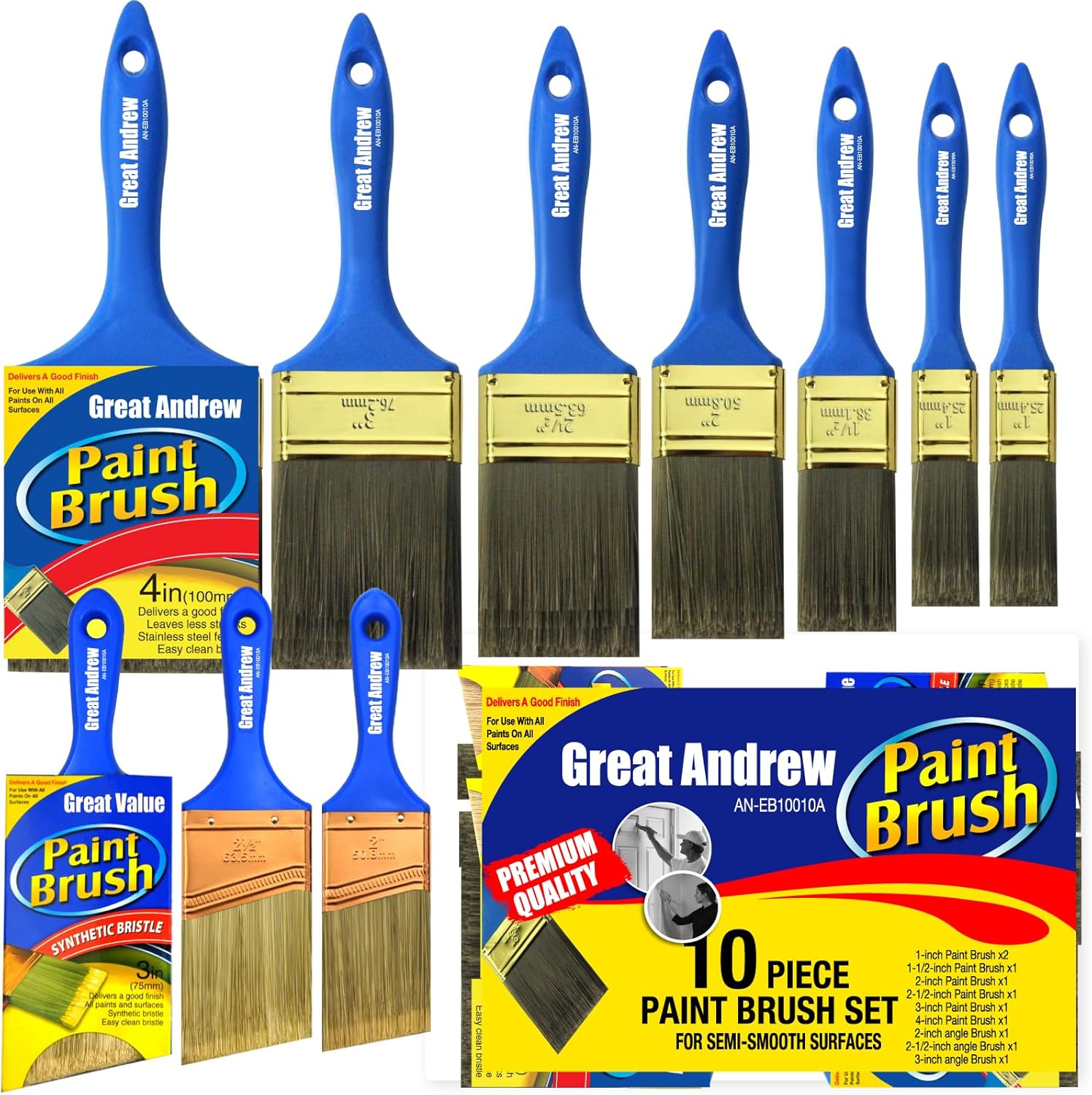 - Great Andrew 10 pack paint brush set includes: 7 flat brushes (1"x2 + 1.5" + 2" + 2.5" + 3" + 4") and 3 angled brushes (2" + 2.5" + 3"). Get all the common sizes of paint brushes in one go for your outdoor and indoor painting projects!