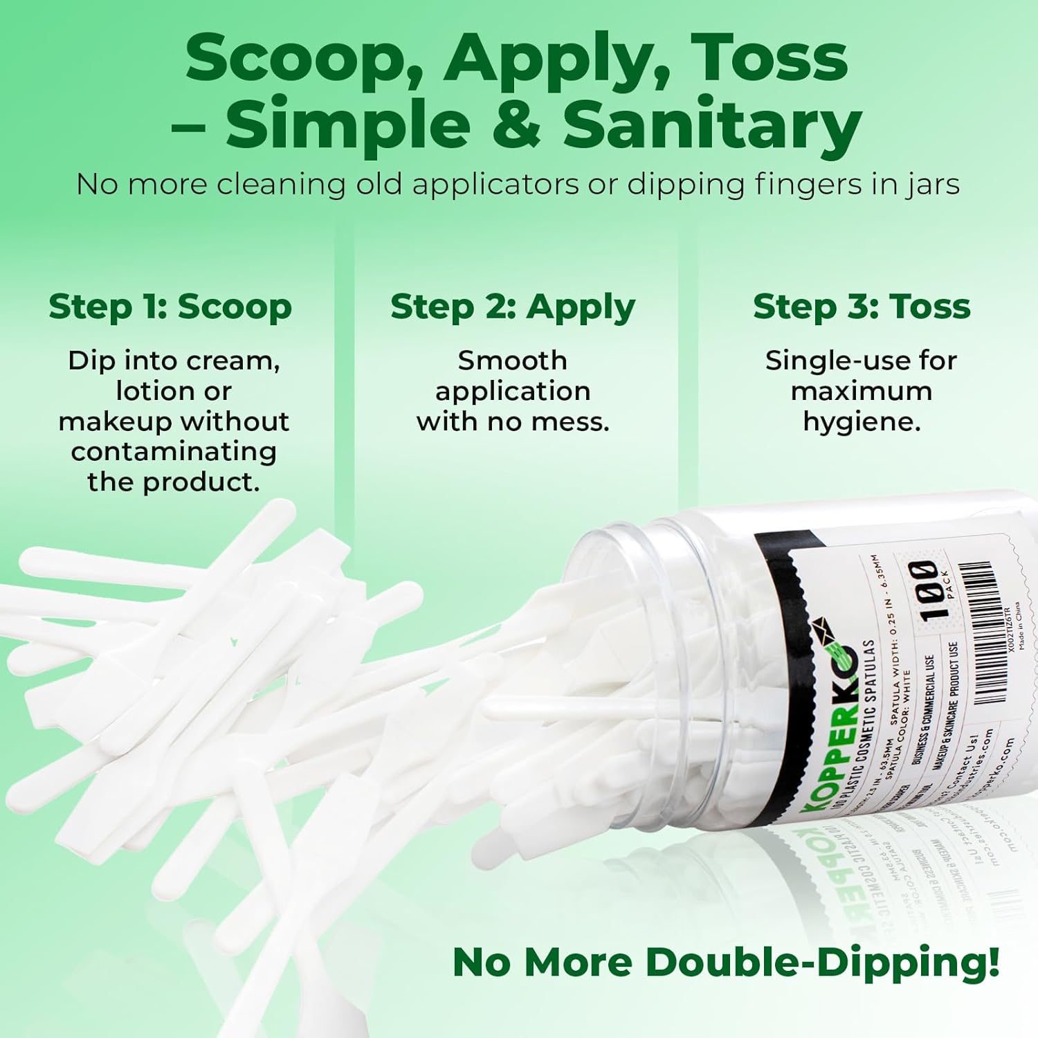 - Clean Out Your Containers: Maximize product use with our 100 pack of 0.25"x2.5" disposable fingertip spatulas. Easily extract creams, lotions, or makeup from containers, even in tight spaces, without getting product under your nails