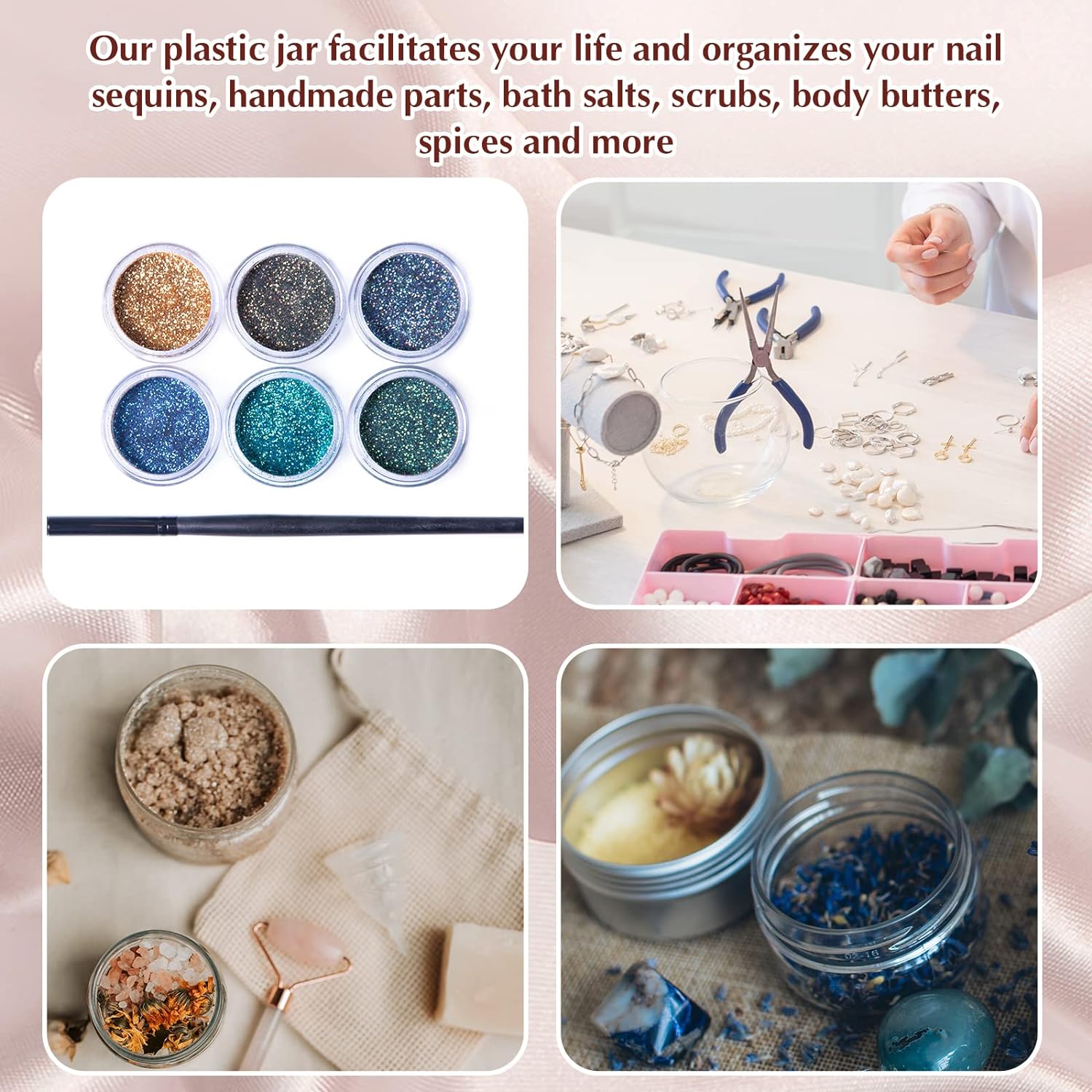 - Multifunctional Containers: you can use these plastic jar containers with lids to store your personal beauty products for travel, ideal to dispense; You can also use it to store homemade sugar scrub cream, body lotions, bath butter soap gifts, body butters and hair moisturizers, small and easily lost jewelry, small crafts like beads, seasonings, acrylic paints, flower seeds, rhinestones etc., which will keep your things organized and make your life more convenient