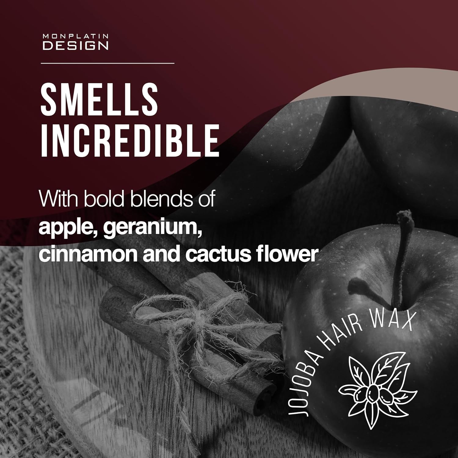- WELL-BEING AND REFRESHMENT: Our Jojoba Hair Wax is suitable for all hair types, including thick and strong hair. It provides long-lasting moisture that penetrates your strands with every application. This scientifically-formulated wax combines jojoba extract, pure water and grape seed oil, delivering a prolonged sense of moisture and a refreshing fragrance of a bold blend of apple, geranium, and cinnamon, with an infusion of cactus flower.