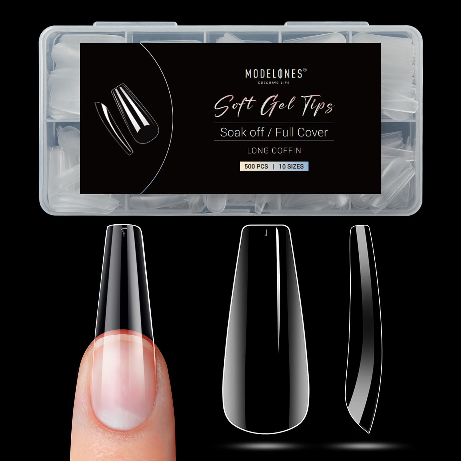 - 10 Sizes Tips Fit Your Nails: Modelones nail extension set includes 500 pcs long coffin nails tips, 10 different sizes with 50 nails of each size, which are individually numbered 0-9. Easy to choose the suitable size for every finger