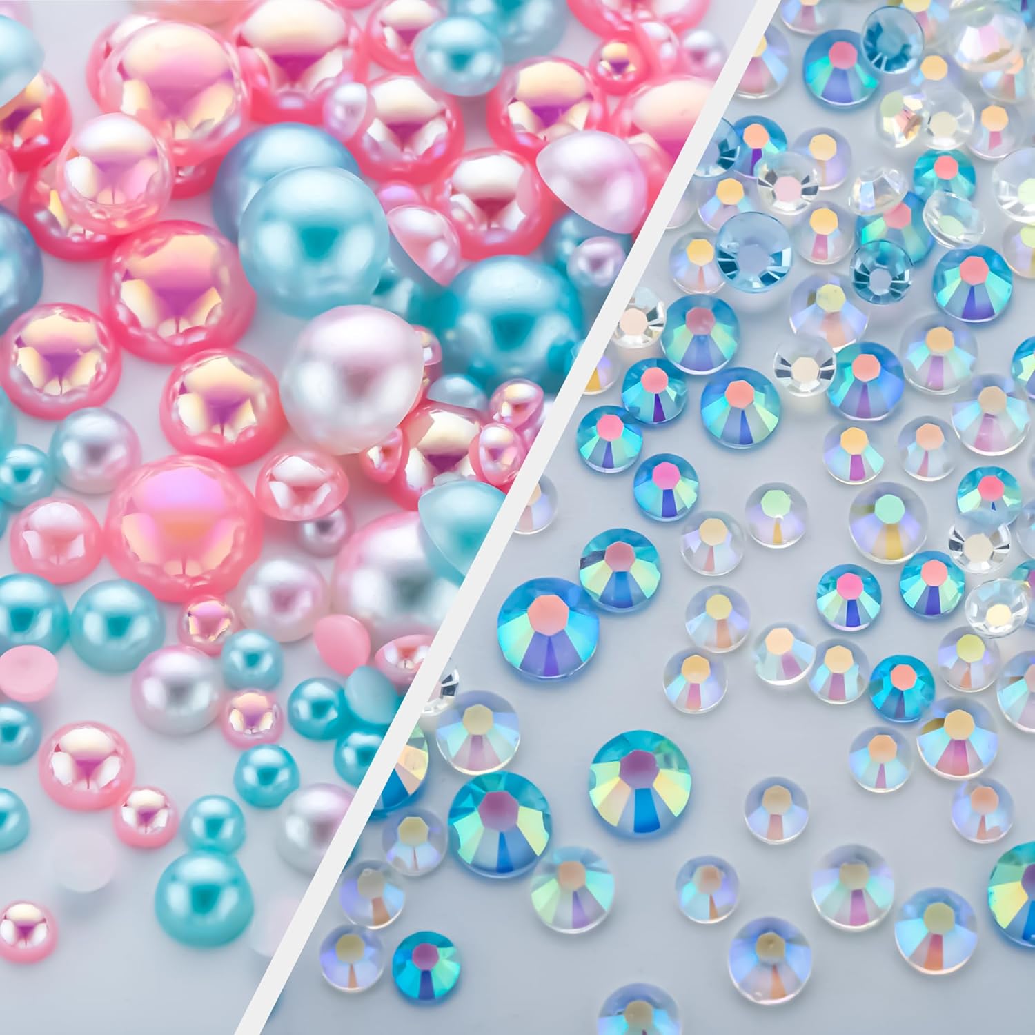 60g Cyan Pink Flat Back Pearls Rhinestones for Crafts Mixed Size 3mm-10mm AB Color Round Half Pearls Flatback Pearl Beads and Resin Rhinestones Set for Face Art with Gel