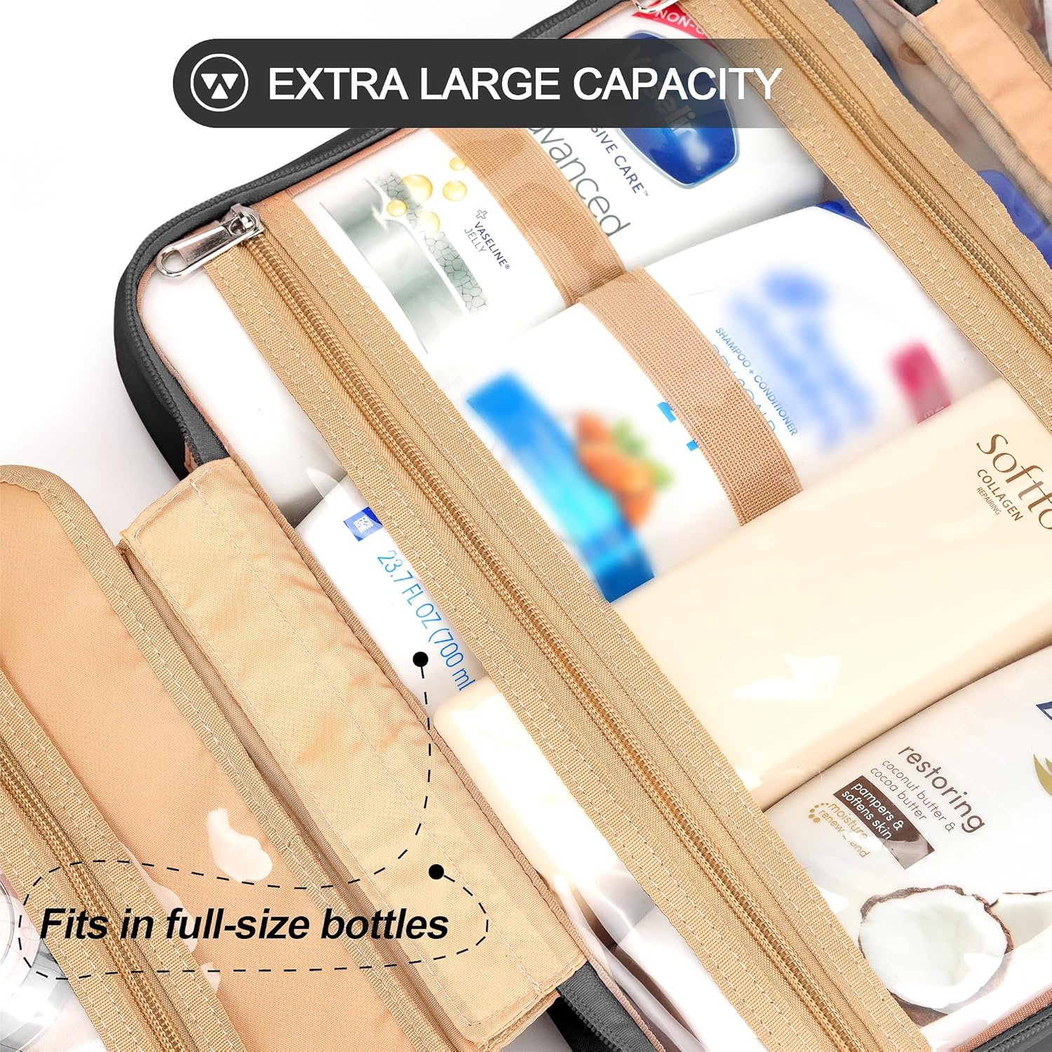 - CONSIDERABLE DESIGN - The elastic bands inside the two main compartments can keep the different height bottles fixed and upright. Your comb, toothbrush, razor, and leak-prone makeup can all go in there, even a hair dryer. 360° metal hook gives you a variety of hanging options.