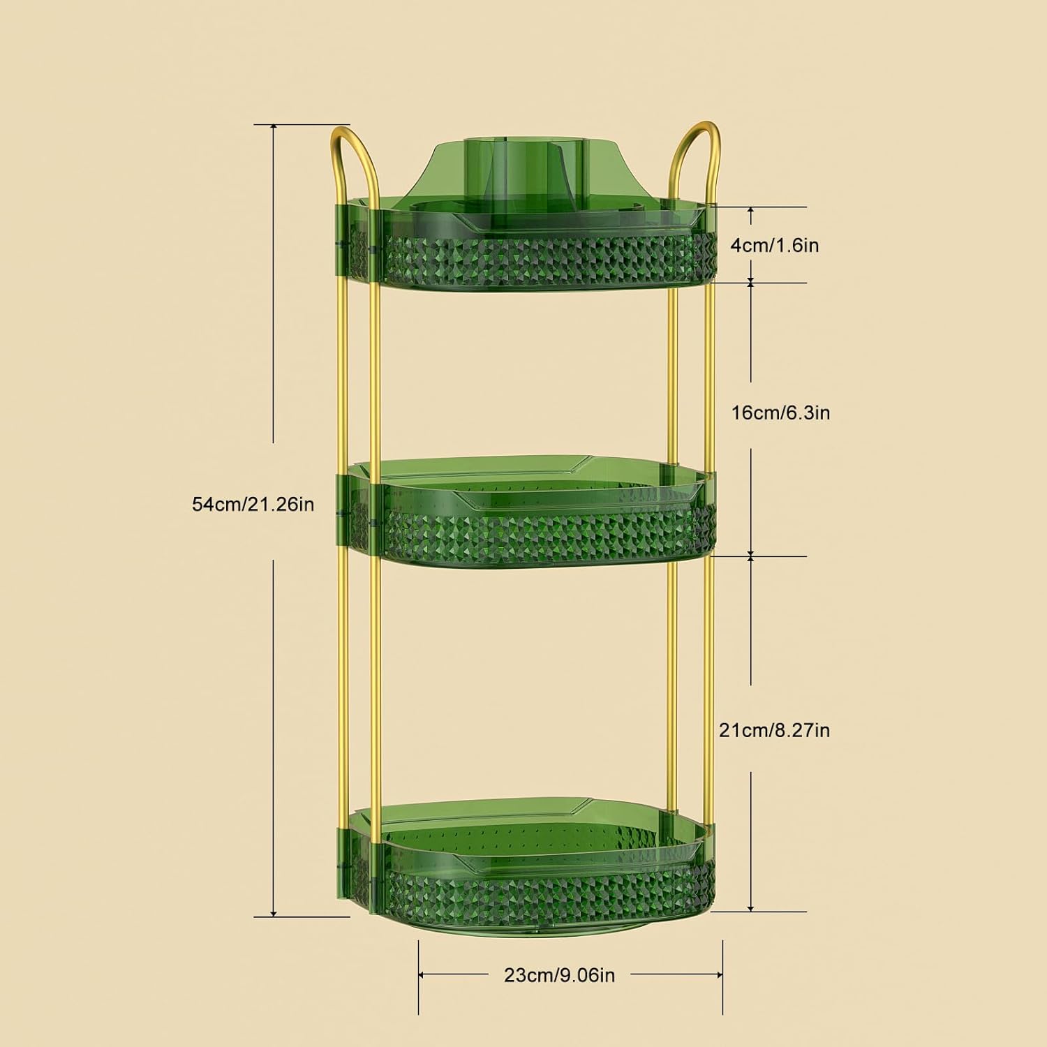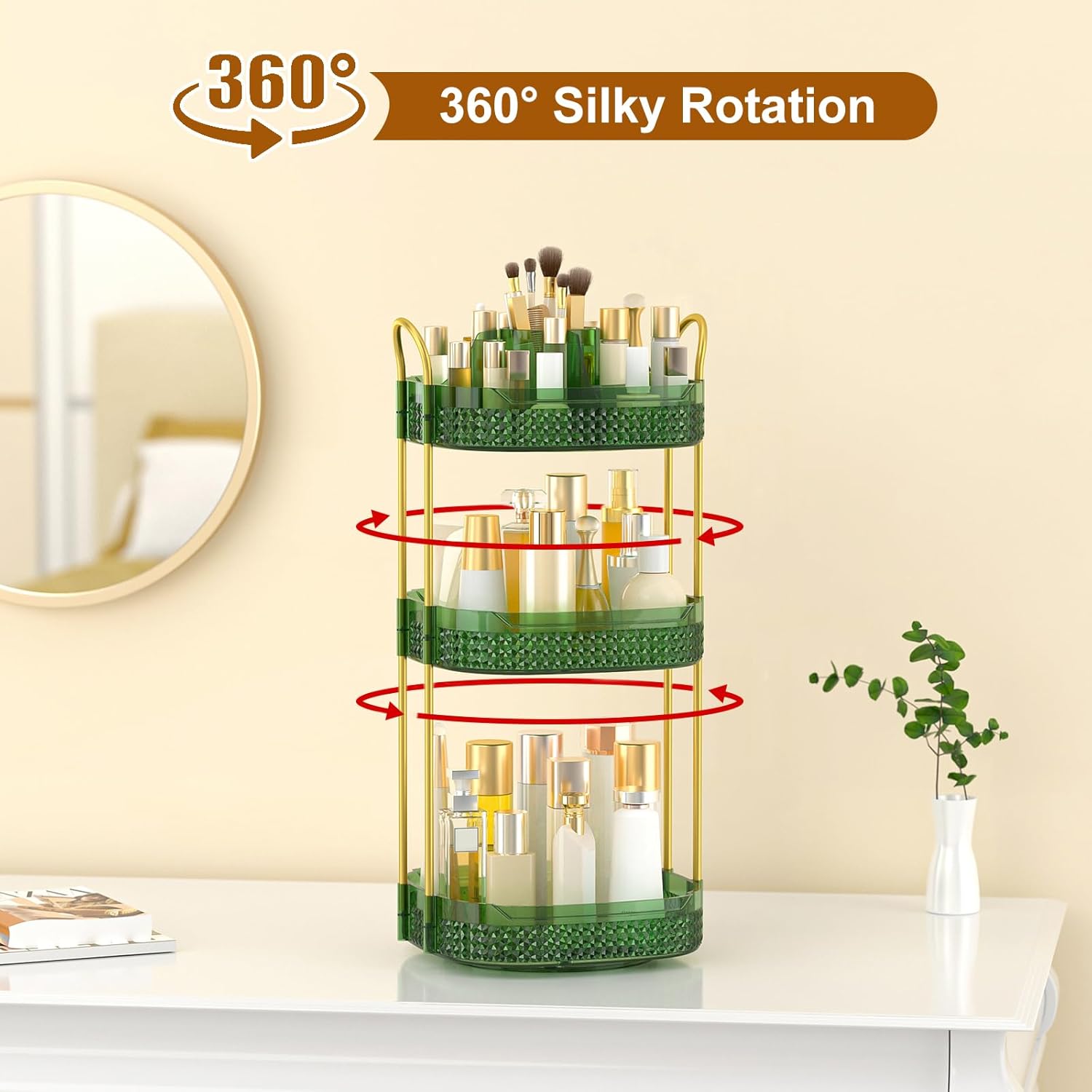 Rotating Makeup Organizer for Vanity 3 Tier, Perfume Organizer with Makeup Brush Holder, Large Capacity Cosmetics Clear Skincare Organizer for Countertop (Green)
