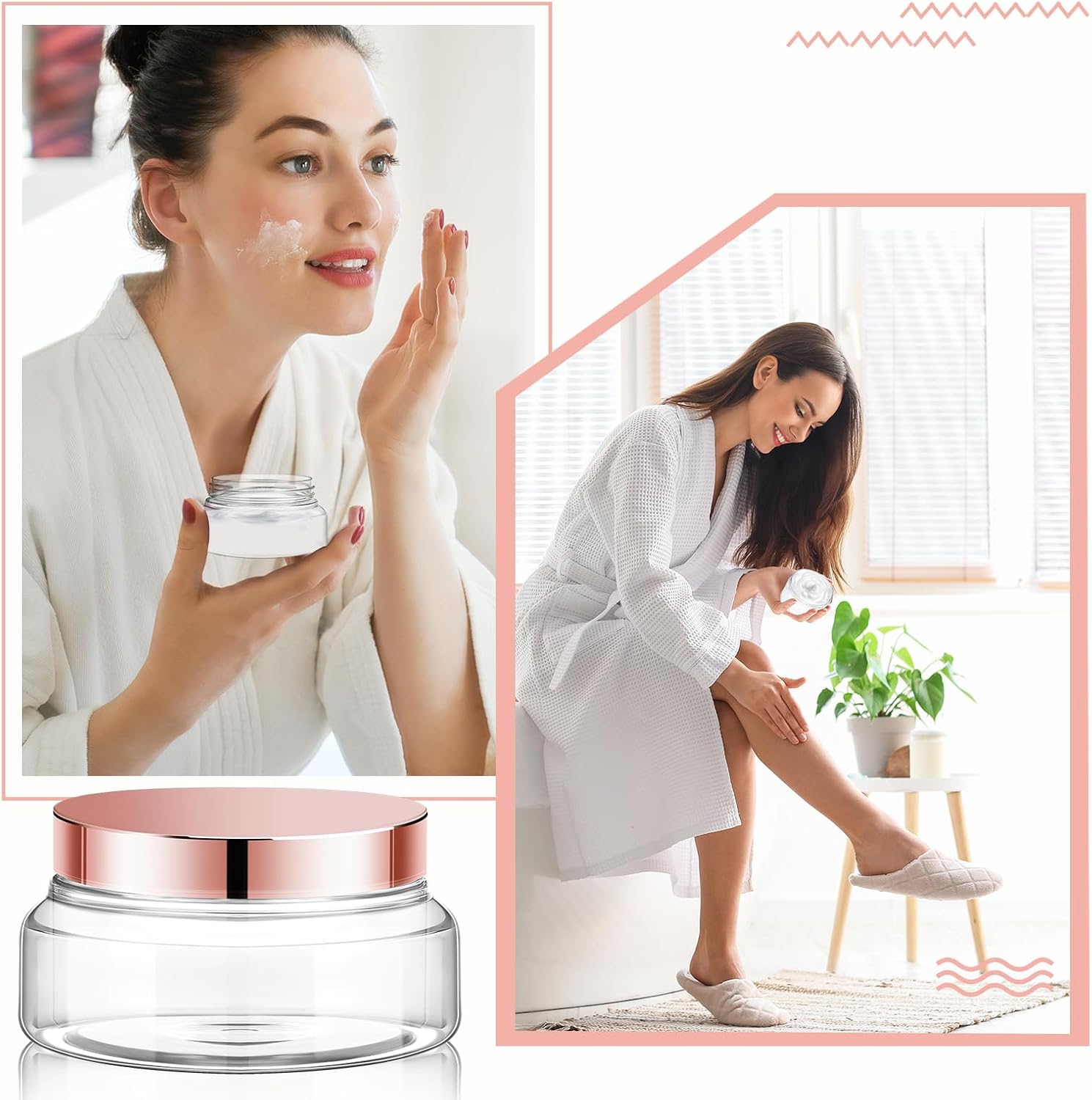 Tessco 24 Pack Plastic Jars with Lids Labels Empty Clear Plastic Jars Round Refillable Cosmetic Containers Body Butter Containers Bulk Sugar Scrub Bottle for Make Up(5 oz,Clear, Rose Gold)