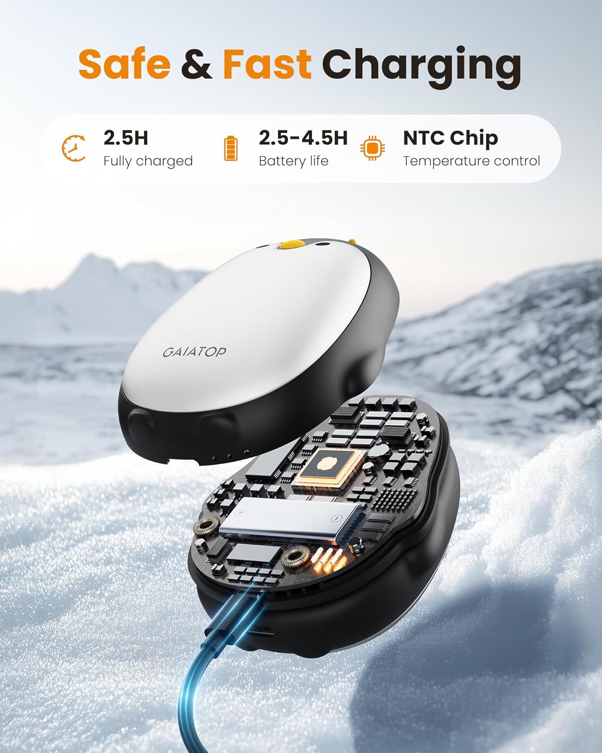 - Long-Lasting Hand Warmers Rechargeable: The reusable electric hand warmer built-in rechargeable batteries, battery life last about 2.5-4.5 hrs, comes with 2 usb cables, the wamer can be fully charged at the same time within 2.5 hrs