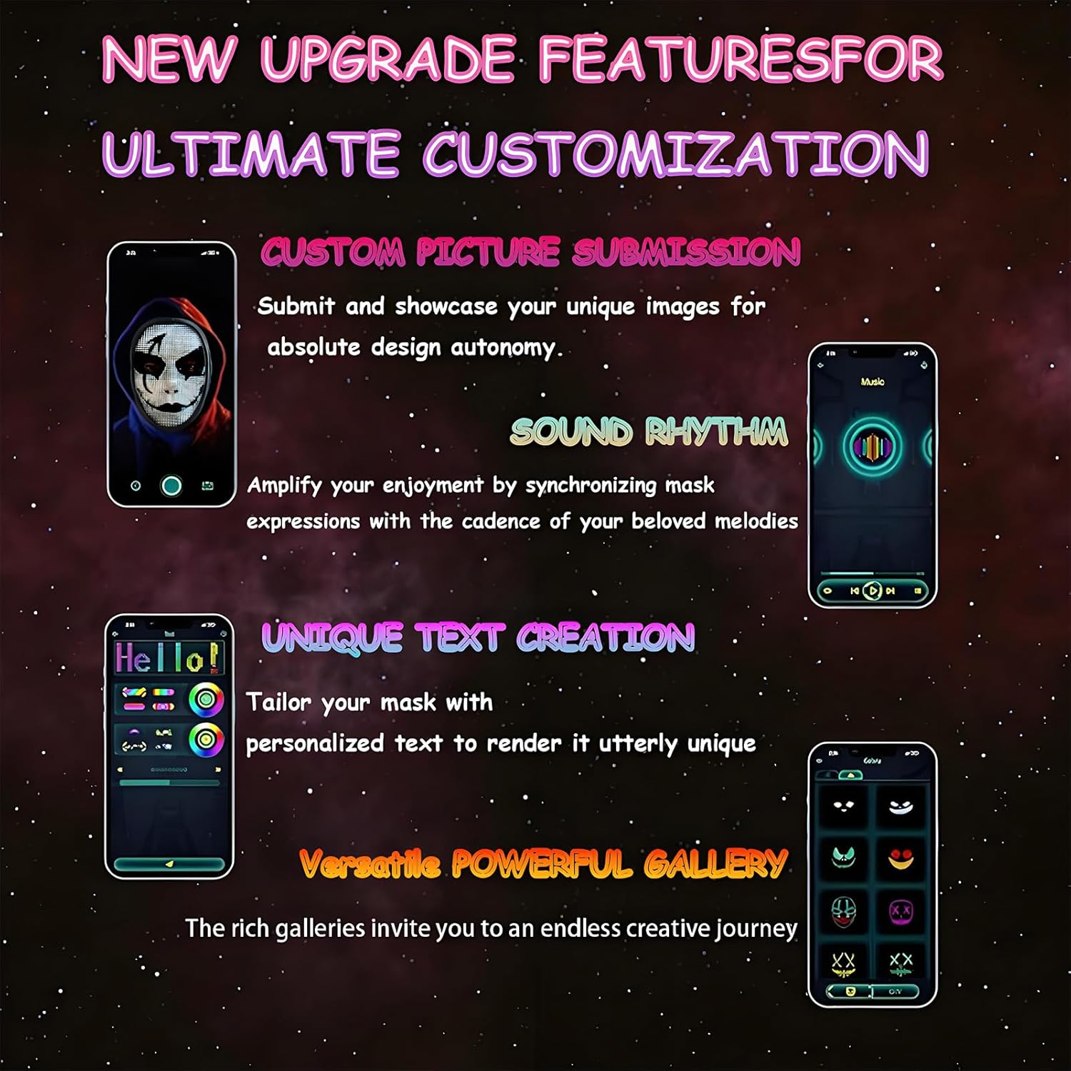 - DIY Your Mask Pattern:The cool mask supports app control.You can diy your digital mask pattern through the phone.You can also edit dynamic text and synchronize music rhythm.Through your imagination,you can become the coolest and most special focus