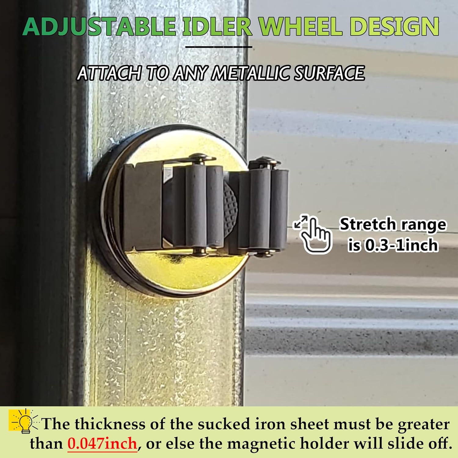 - [Magnetic Mop Broom Holder]: Magnetic mop broom holder with petal shaped rollers. With strong grip and friction to prevent tools from slipping. Keep your cleaning tools organized and within reach. Free up valuable floor space.