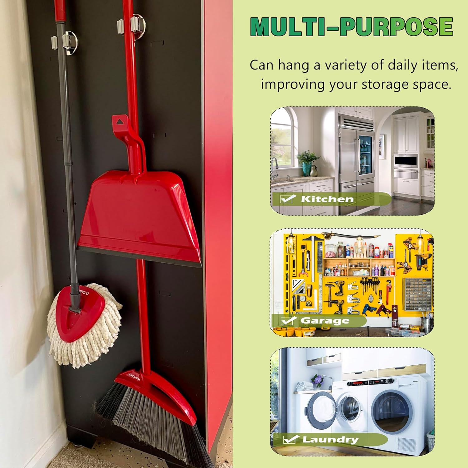 - [Multi-purpose Magnetic Mop Clip]: This mop holder can be widely used for storage to keep your laundry room, garden, garage clean and tidy. From umbrellas, mops, shovels, brooms to gardening or hardware tools, we can use this holder to hold them all.