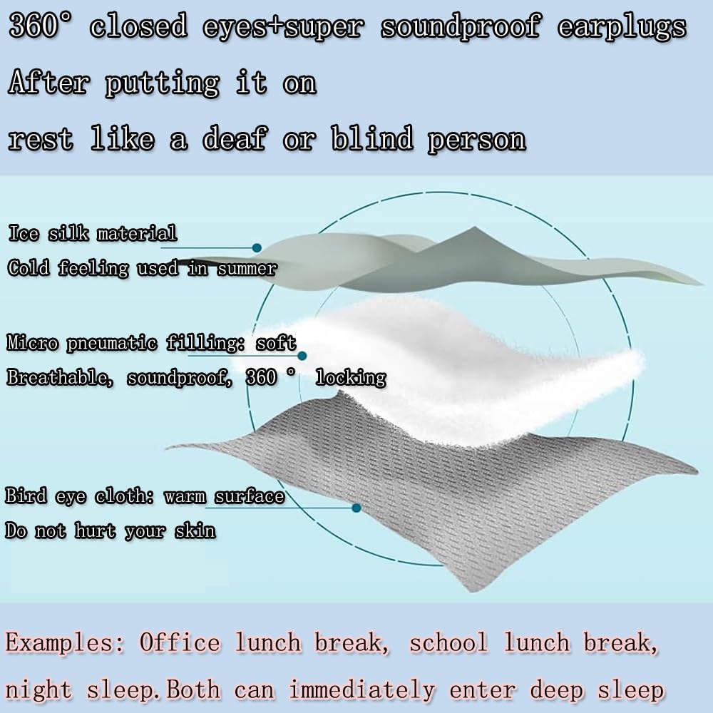 - Eye Mask+Earplugs: 360 Β° blackout sleep mask, filled with micro air cotton material, the mask is very gentle and covers the eyes all night long, without squeezing the nose, ears, and skin, and will not harm the skin. At the same time, wearing silicone earplugs, soft material, will not squeeze the ears, with 4 levels of sound insulation effect, will make you sleep like a deaf or blind person, quickly entering deep sleep