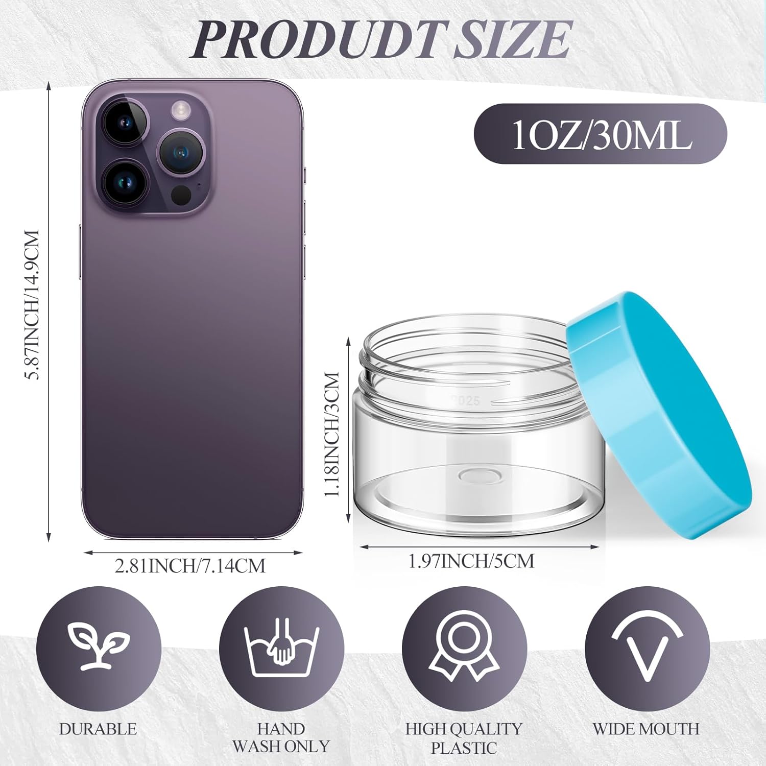 - Product size: each wide-mouth plastic containers jars measure 5.2 cm/ 2.05 inches in diameter, 3.3 cm/ 1.3 inches in height wide, the volume is 1 oz; These are empty jars, great for meal preparation, condiments, DIY crafts, creams, butters, lotions and others