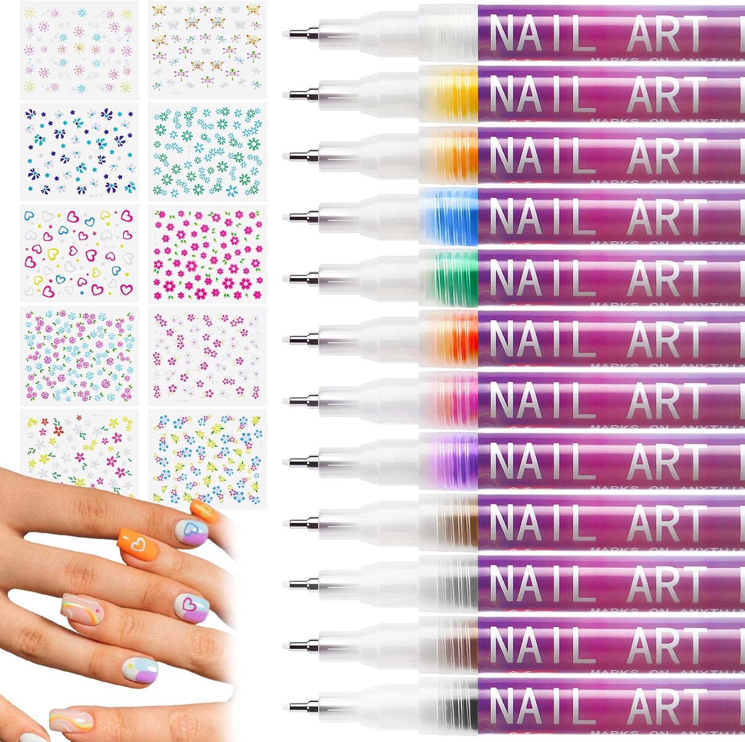 - PACKAGE INCLUDES:You will receive 12 nail polish markers in a variety of colors and 10 beautiful nail art stickers with a variety of designs. These stickers allow you to quickly decorate your nails without complicated painting, easily meeting the needs of various people