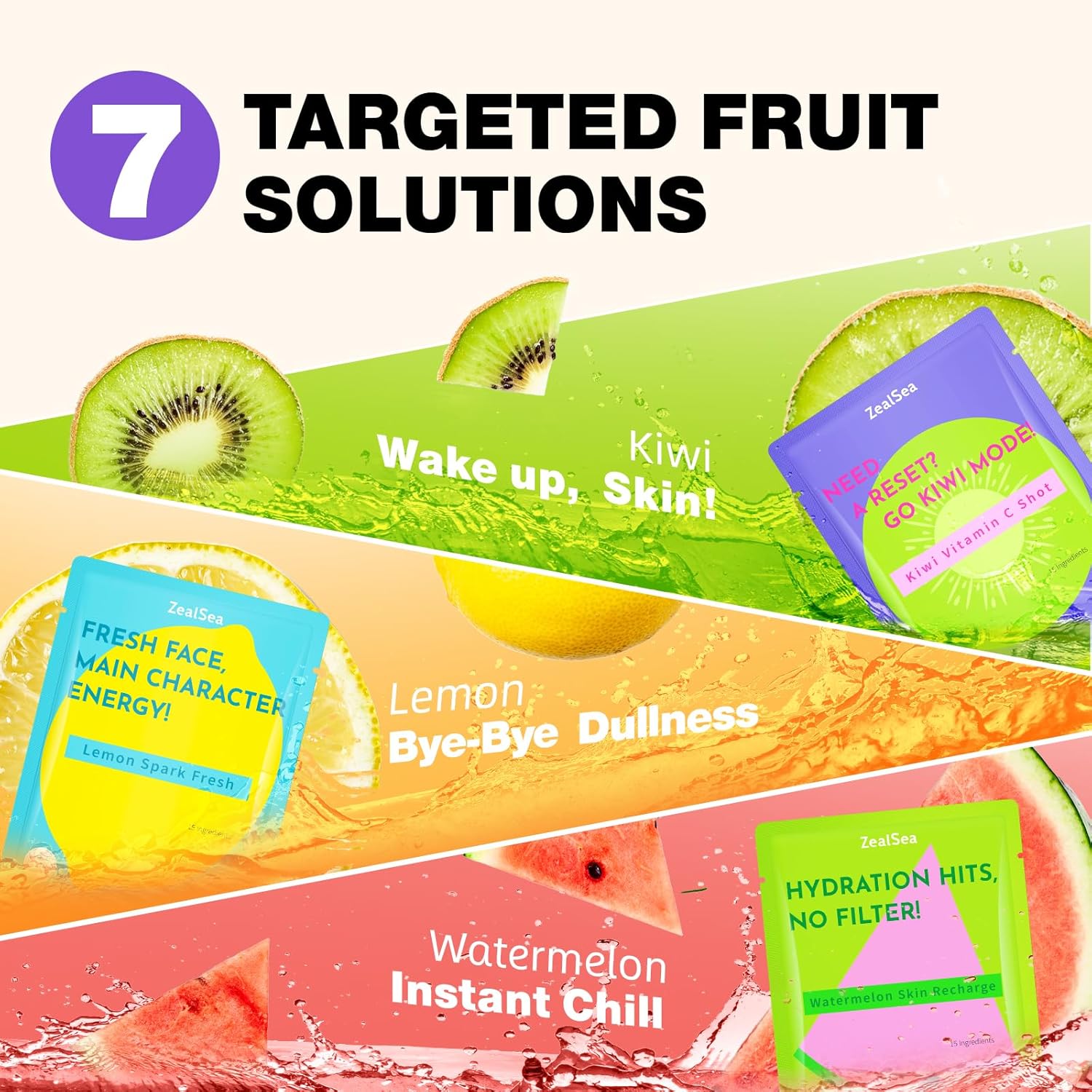 - 7 Targeted Fruit Solutions: Choose your glow! Avocado deeply moisturizes, Lemon glows, Watermelon refreshes, Kiwi energizes, Coconut hydrates, Peach plumps, and Lychee balances oil and water. Tailor your self-care ritual to your skin's daily needs