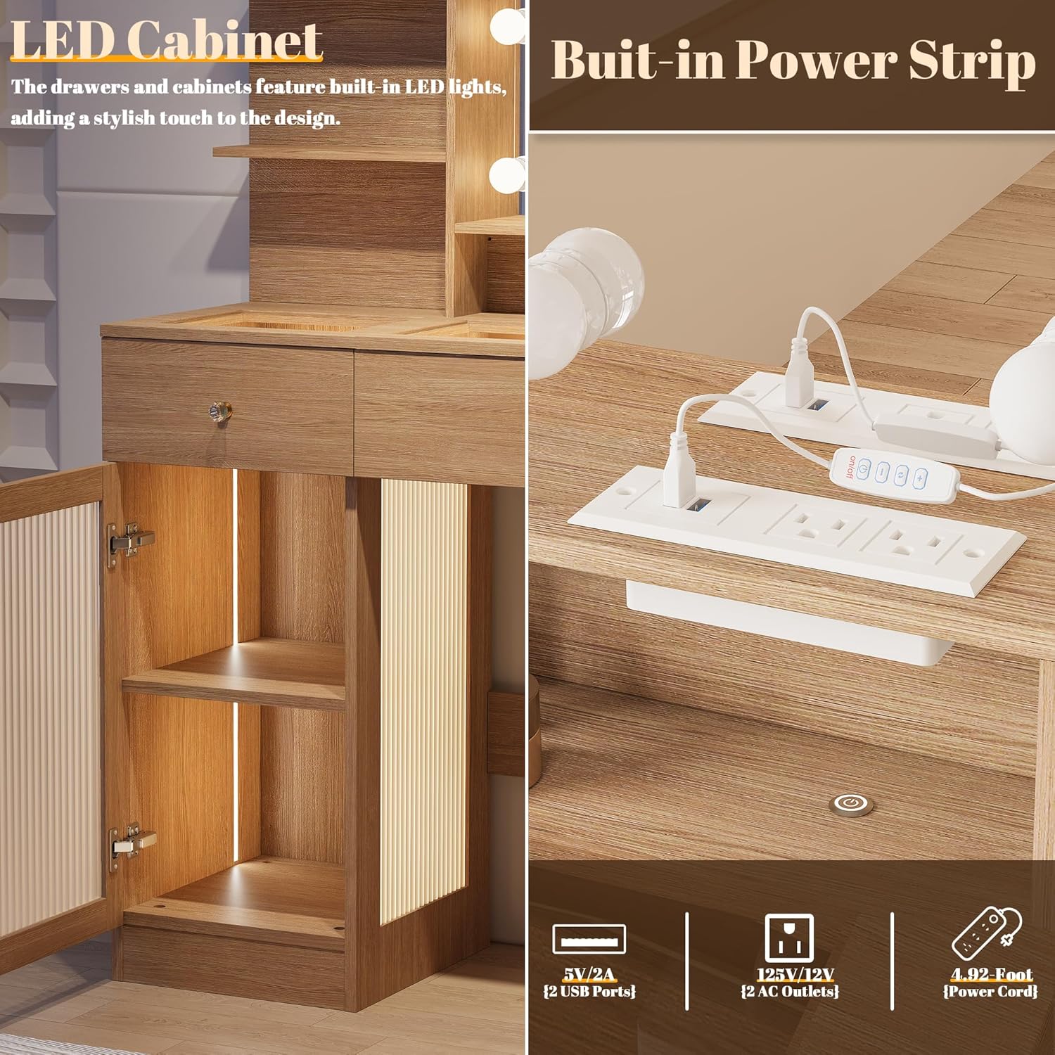 - ăBuilt-in Charging Station and Hair Dryer Standăvanity with lights includes 2 standard electrical outlets, 2 USB ports, and a dedicated hair dryer stand, allowing you to conveniently connect and charge your hair tools, smartphones, tablets, and other devices.Stay organized and worry-free with our multifunctional girls vanity.