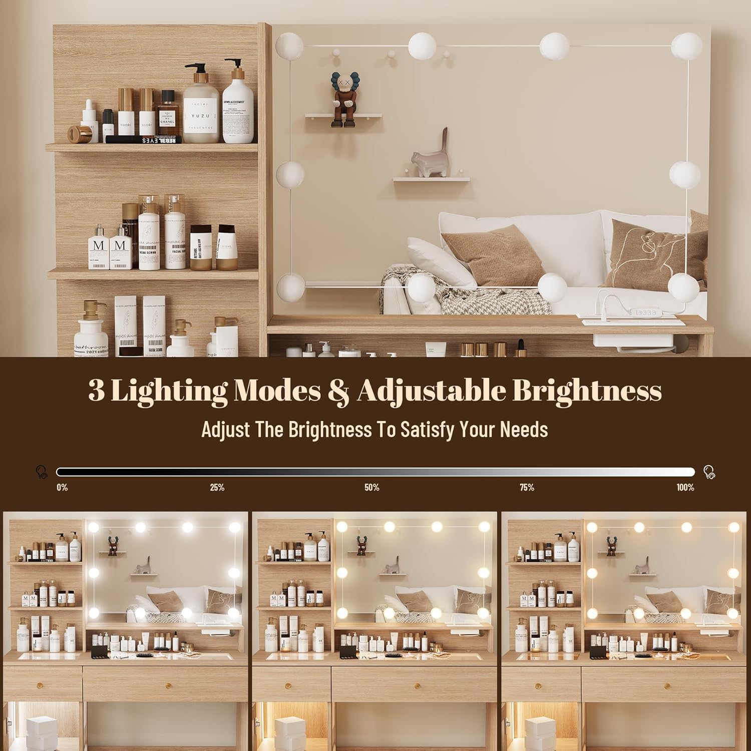 - ăVanity Set with Large Mirror and LED LightsăThis makeup vanity desk with lights features a large mirror with 10 Hollywood-style LED bulbs. Choose from 3 color modes (warm yellow, warm white, and cool white) and adjust the brightness settings to create the perfect lighting for your makeup needs. Ideal for home, work, hair salons, and studio makeup applications.